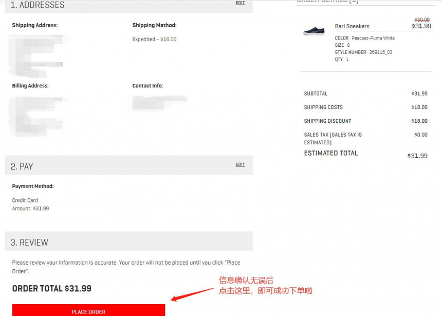 第三步【REVIEW】就是检查前面两步填写的内容对不对,如果没有问题,点击*下面的【PLACE ORDER】即可成功下单啦!