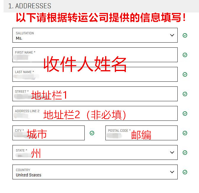 *步【ADDRESSES】需要填写的是收件地址,彪马不支持直邮中国,所以请使用美国的转运地址哦,以下这些栏目可以根据转运公司提供的信息进行填写。